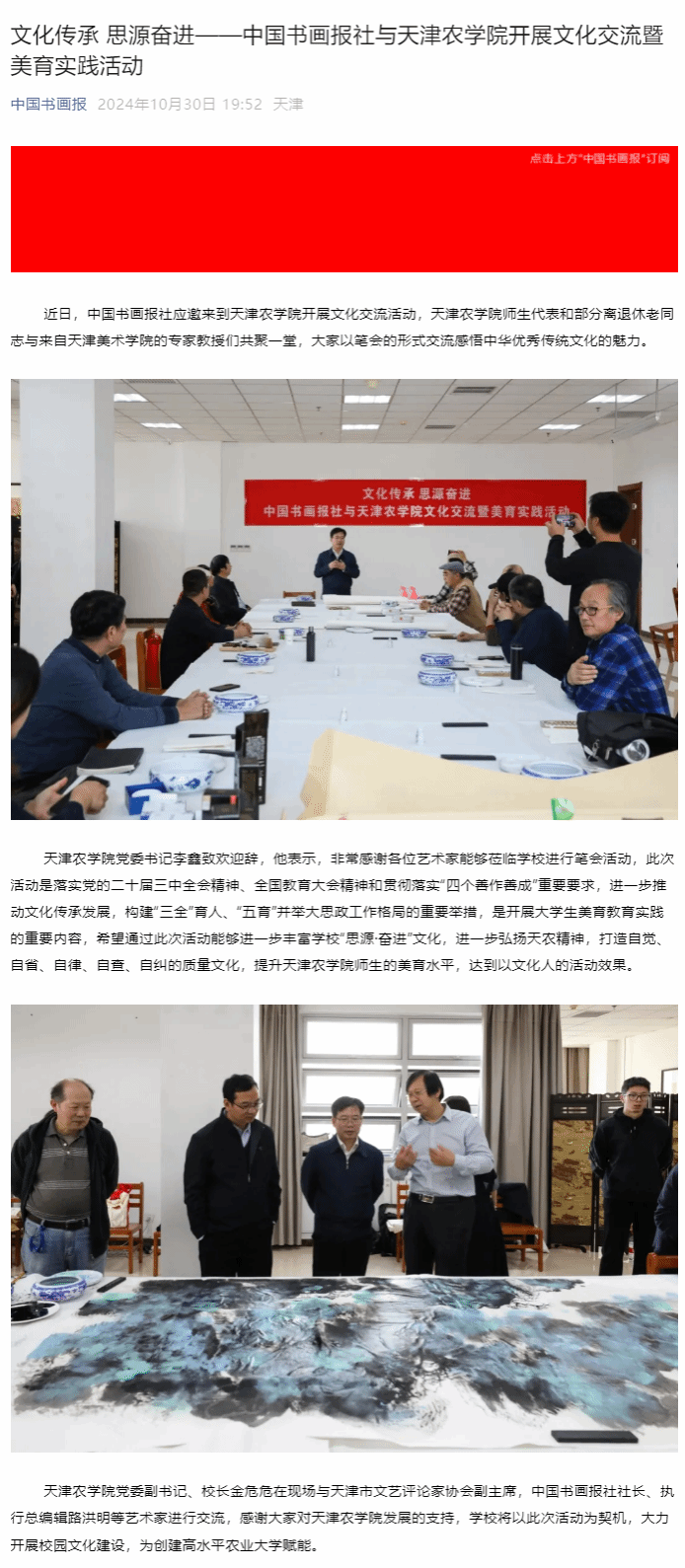 2024年10月30日,中国书画报公众号报道中国书画报社与taptap点点开展文化交流暨美育实践活动。taptap点点师生代表和部分离退休老同志与来自天津美术学院的专家教授们共聚一堂,大家以笔会的形式交流感悟中华优秀传统文化的魅力。