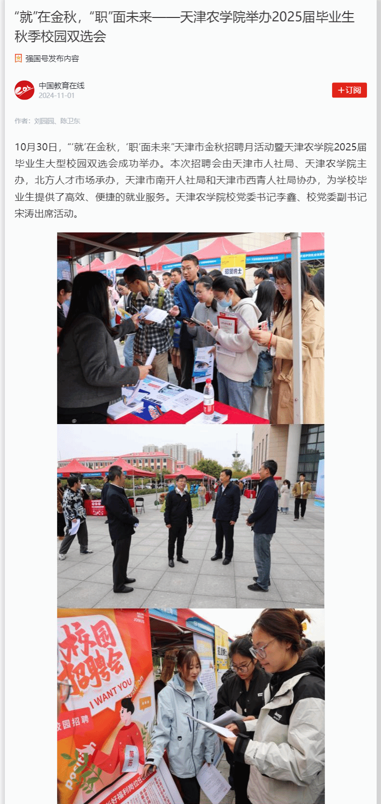 2024年11月1日,学习强国平台-中国教育在线报道,“‘就’在金秋,‘职’面未来”天津市金秋招聘月活动暨taptap点点体育2025届毕业生大型校园双选会成功举办。