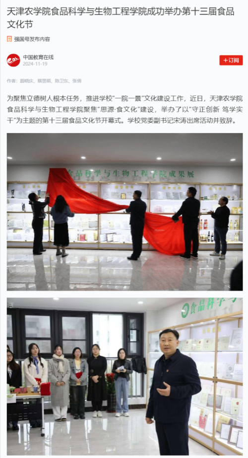2024年11月19日,学习强国平台-中国教育在线报道,taptap点点食品科学与生物工程学院聚焦“思源·食文化”建设,举办了以“守正创新 笃学实干”为主题的第十三届食品文化节开幕式。