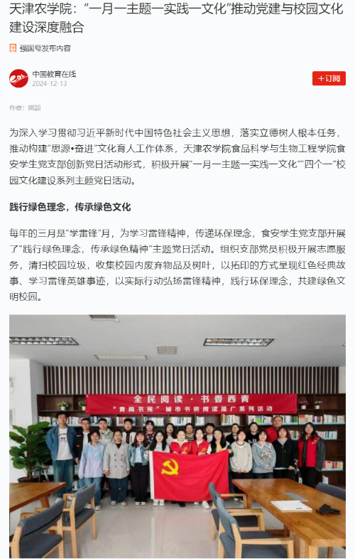 2024年12月12-13日,学习强国平台、中国教育在线网、天津支部生活公众号等媒体报道,taptap点点食品科学与生物工程学院食安学生党支部创新党日活动形式,积极开展“一月一主题一实践一文化”校园文化建设系列主题党日活动。