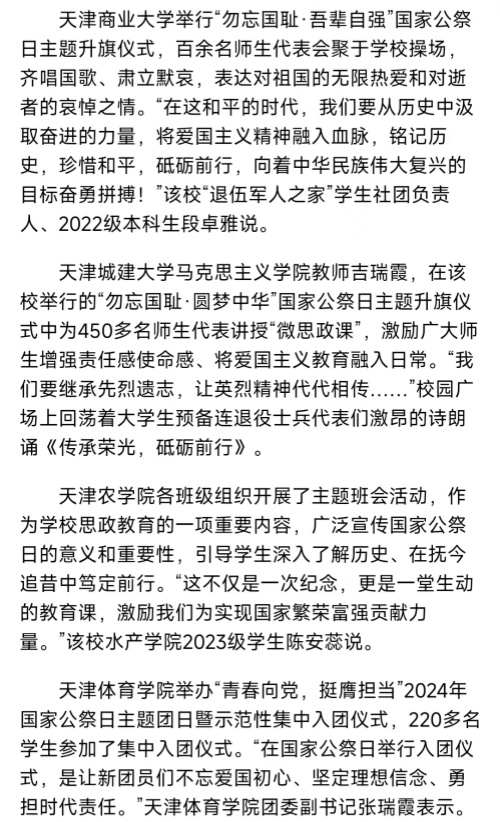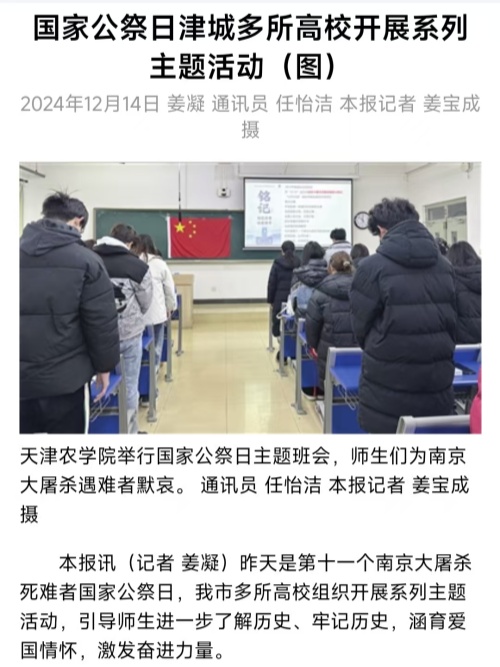 2024年12月13-14日,《天津日报》、津云报道taptap点点举行“思源奋进 强我中华”国家公祭日纪念活动。学校将此项活动作为思想政治教育的一项重要内容,纳入课堂教育教学,组织全校师生在课堂同步进行奏唱国歌,进行默哀等仪式。同时,各学院还组织召开了南京大屠杀死难者国家公祭日主题教育班会。