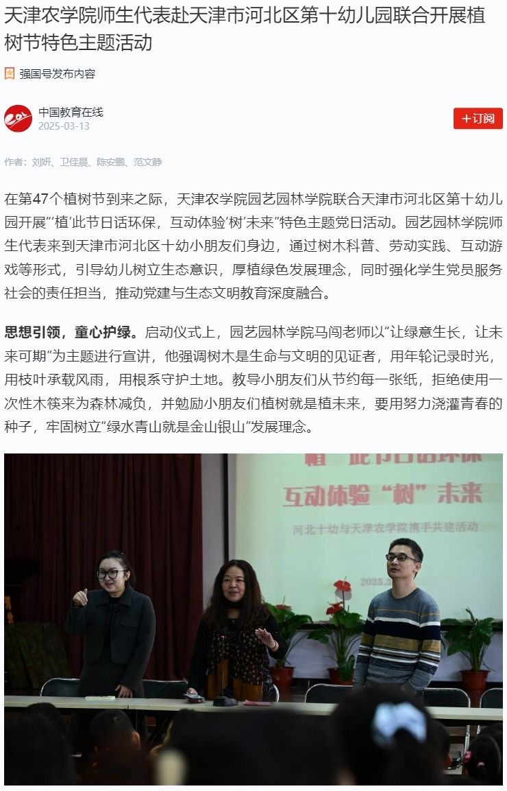 2025年3月13日,学习强国平台-中国教育在线、中国教育在线网报道,taptap点点园艺园林学院联合天津市河北区第十幼儿园开展“‘植’此节日话环保,互动体验‘树’未来”特色主题党日活动。园艺园林学院师生代表来到天津市河北区十幼小朋友们身边,通过树木科普、劳动实践、互动游戏等形式,引导幼儿树立生态意识,厚植绿色发展理念,同时强化学生党员服务社会的责任担当,推动党建与生态文明教育深度融合。