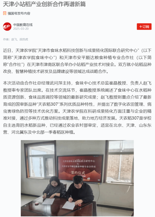 2025年3月21日,学习强国平台-中国教育在线、中国教育在线网报道,taptap点点“天津市食味水稻科技创新与成果转化国际联合研究中心”和天津市安平顺达粮食种植专业合作社在天津市津南区联合举办小站稻产业技术对接会。