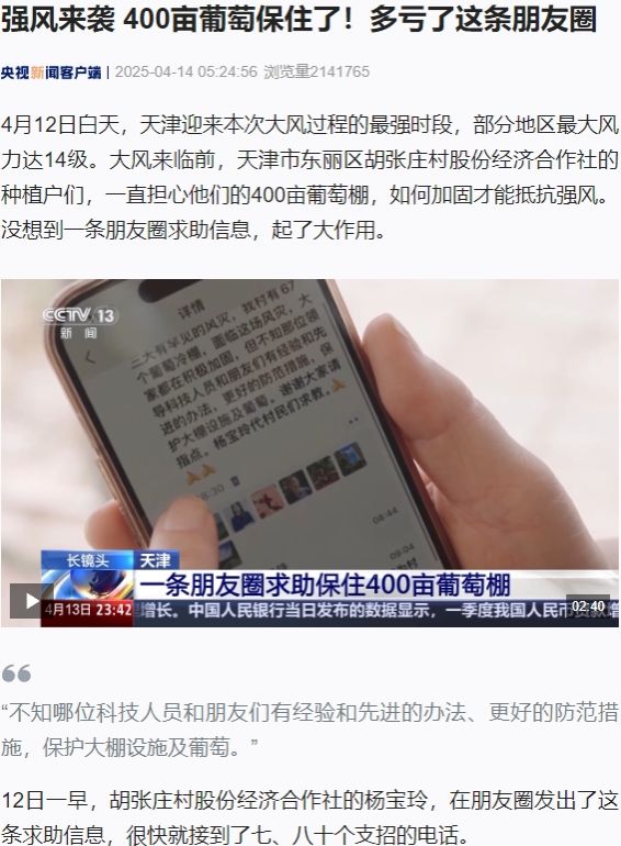 2025年4月14日,央视新闻客户端、央视新闻《朝闻天下》、央视新闻《长镜头》、津门教育公众号等多家媒体、栏目报道taptap点点园艺园林学院田淑芬研究员指导天津市东丽区葡萄种植户应对大风天气开展农业设施加固。