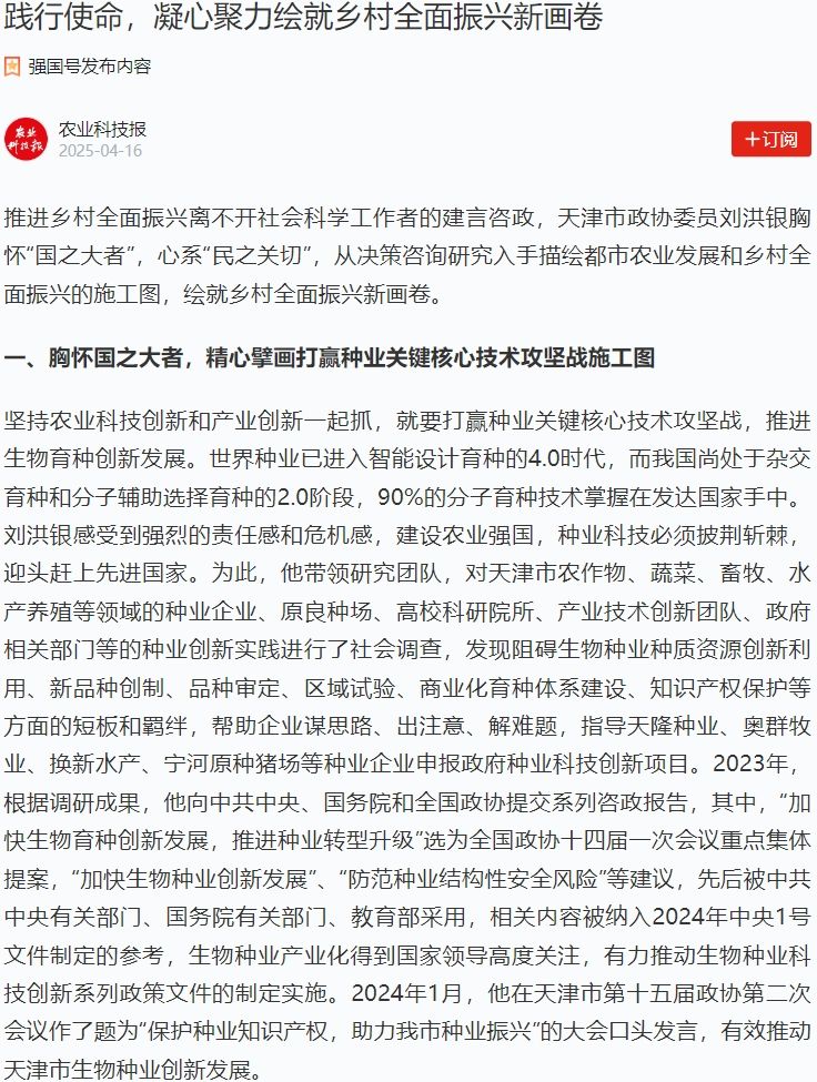 2025年4月16日,学习强国平台-农业科技报报道,天津市政协委员、taptap点点人文学院教授刘洪银胸怀“国之大者”,心系“民之关切”,从决策咨询研究入手描绘都市农业发展和乡村全面振兴的施工图,绘就乡村全面振兴新画卷。