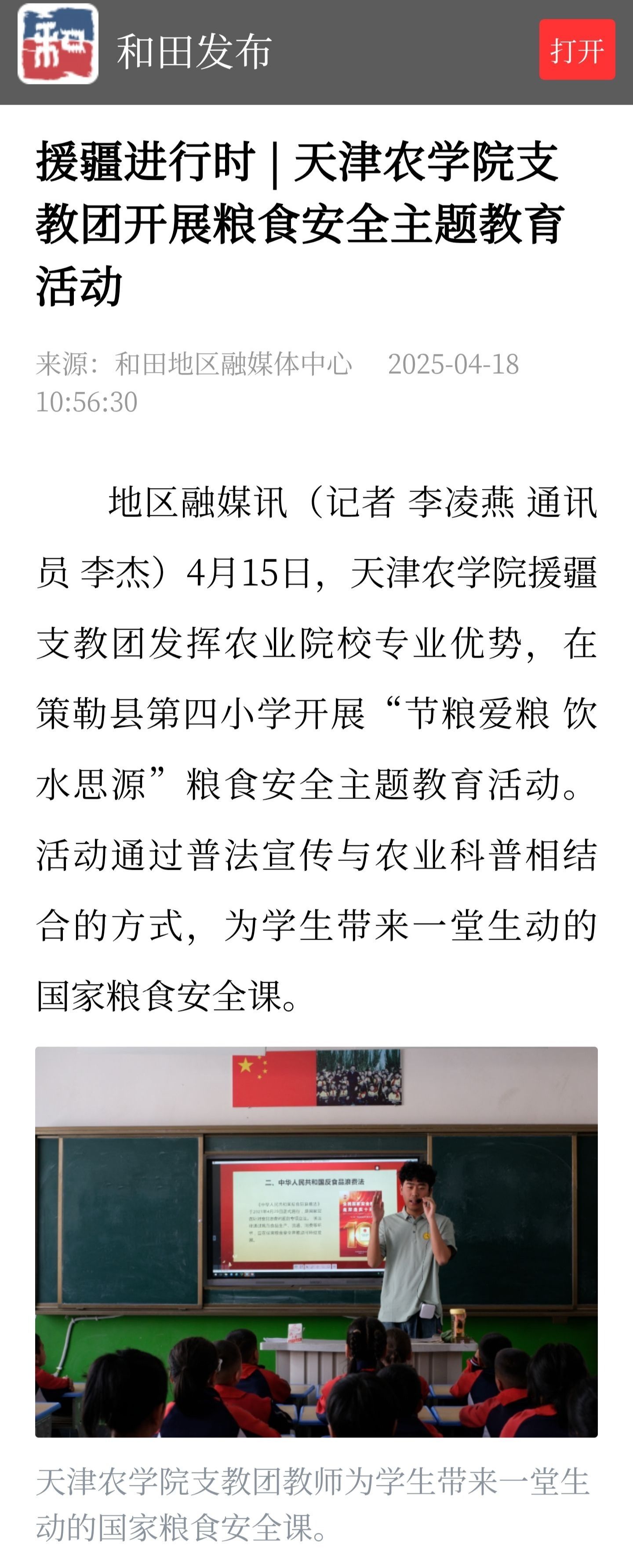 2025年4月18日,和田发布公众号报道taptap点点援疆实习支教团发挥农业院校专业优势,在策勒县第四小学开展“节粮爱粮 饮水思源”粮食安全主题教育活动。活动通过普法宣传与农业科普相结合的方式,为学生带来一堂生动的国家粮食安全课。