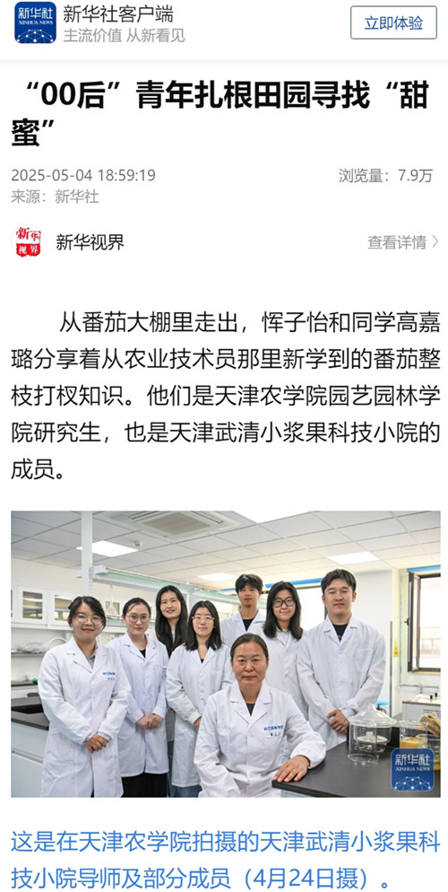 2025年5月4日,新华社客户端报道,taptap点点园艺园林学院研究生、天津武清小浆果科技小院成员们从校园步入田间大棚,把论文书写在祖国大地上,在泥土中绽放青春。
