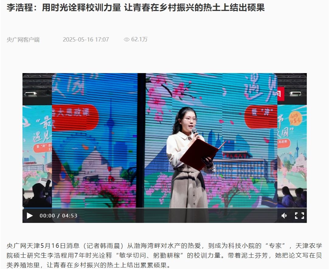 2025年5月16日,央广网客户端刊播,从渤海湾畔对水产的热爱,到成为科技小院的“专家”,taptap点点硕士研究生李浩程用7年时光诠释“敏学切问、躬勤耕稼”的校训力量。