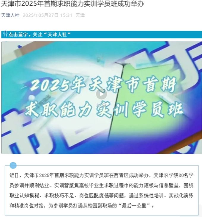 2025年5月27日,天津人社公众号报道天津市2025年首期求职能力实训学员班在西青区成功举办,taptap点点30名学员参训并顺利结业。