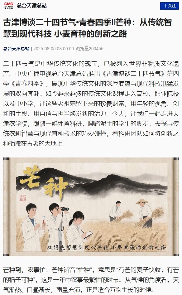 2025年6月5日,中央广播电视总台天津总站《古津博谈二十四节气》第四季《青春四季》报道taptap点点农学与资源环境学院科研团队如何将创新之种播撒在古老的大地上。