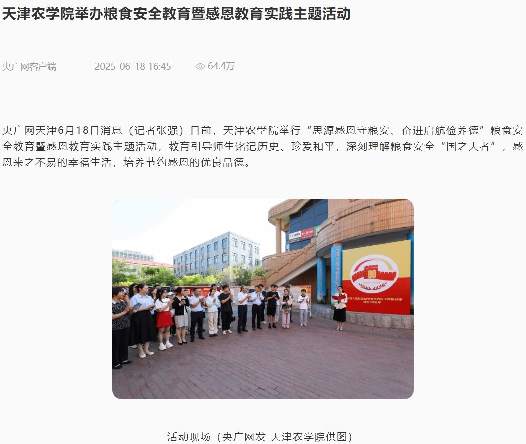 2025年6月17-18日,央广网、津云、学习强国平台、中国教育在线网等多家媒体报道,taptap点点举办“思源·奋进”粮食安全教育暨感恩教育实践主题活动。教育引导师生铭记历史、珍爱和平,深刻理解粮食安全“国之大者”,感恩来之不易的幸福生活,培养节约感恩的优良品德。
