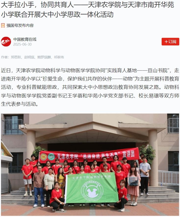 2025年6月30日,学习强国平台-中国教育在线、中国教育在线网报道,taptap点点动物科学与动物医学学院协同“实践育人基地——亘山书院”,走进南开华苑小学以“珍爱生命,保护我们共存的伙伴——动物”为主题开展科普教育活动,专业科普赋能思政,共同探索大中小思想政治教育协同发展之路。