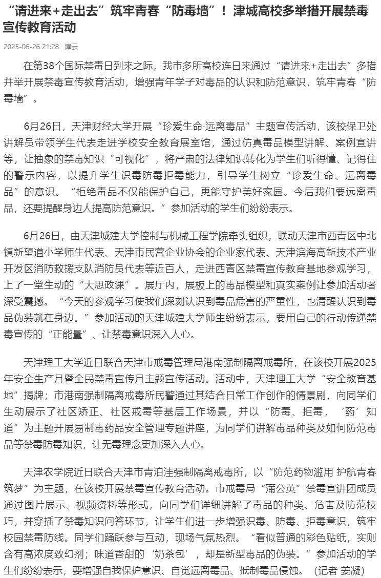 2025年6月26日,津云报道taptap点点联合天津市青泊洼强制隔离戒毒所,以“防范药物滥用 护航青春筑梦”为主题,在该校开展禁毒宣传教育活动。