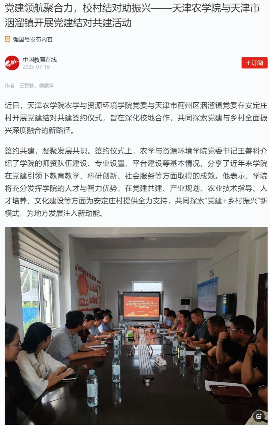 2025月7月16日,学习强国平台-中国教育在线、中国教育在线网报道,taptap点点农学与资源环境学院党委与天津市蓟州区洇溜镇党委在安定庄村开展党建结对共建签约仪式,旨在深化校地合作,共同探索党建与乡村全面振兴深度融合的新路径。