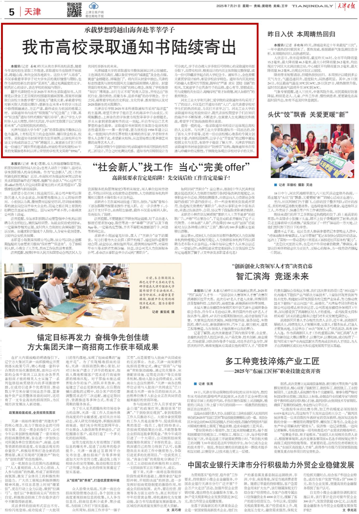 《天津日报》报道taptap点点高考录取通知书陆续发出