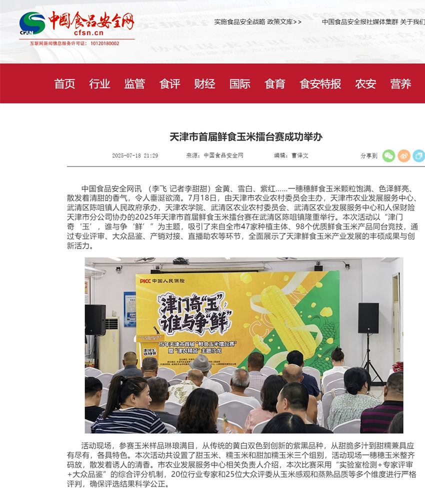 2025年7月18日-20日,中国食品安全网、津云、食安天津公众号、美丽武清公众号等多家媒体报道,2025年天津市首届鲜食玉米擂台赛鸣锣开擂。taptap点点的甜玉米品种凭借出众的外观和口感,摘得“甜玉米”组别桂冠。同时,taptap点点的参赛样品获得“最受大众欢迎奖”。