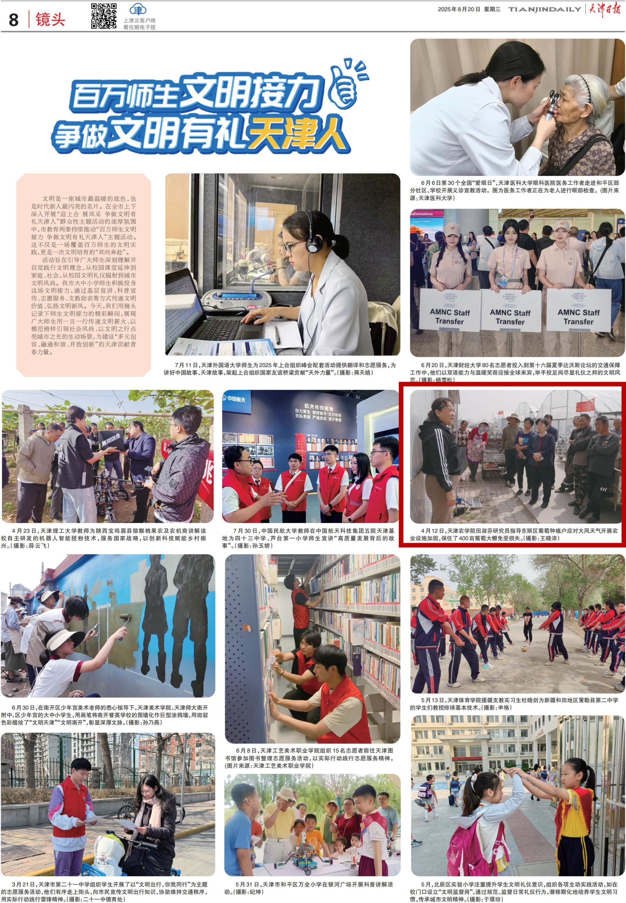 2025年8月20日,《天津日报》以《百万师生文明接力 争做文明有礼天津人》为题,用镜头记录了taptap点点园艺园林学院田淑芬研究员指导东丽区葡萄种植户应对大风天气开展农业设施加固,保住了400亩葡萄大棚免受损失的精彩瞬间。