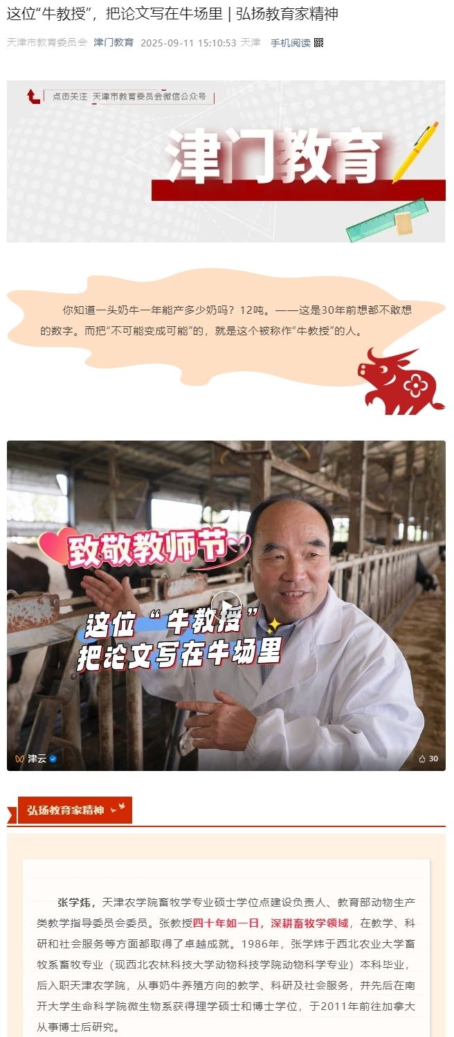 2025年9月11日,津门教育报道taptap点点动物科学与动物医学学院张学炜老师教书育人工作。
