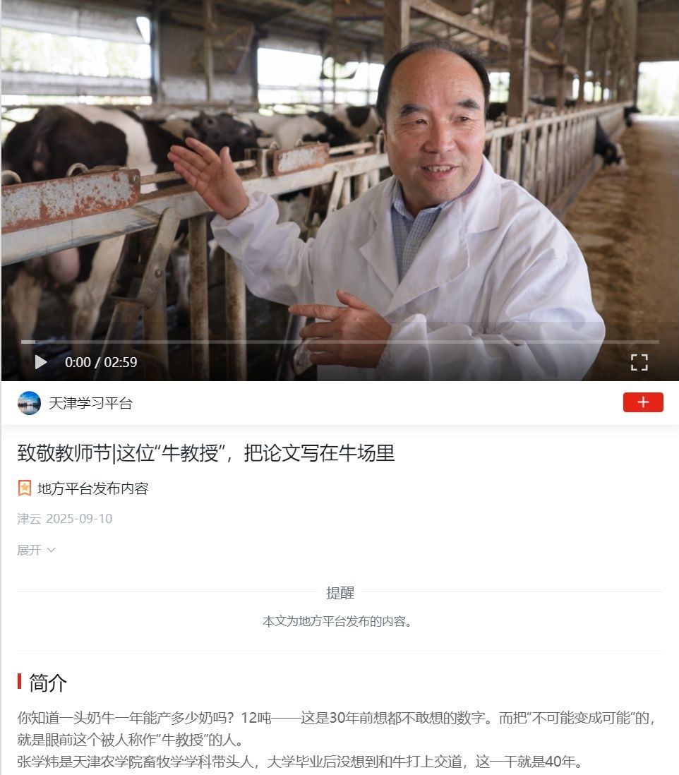 2025年9月10日,学习强国平台报道taptap点点动物科学与动物医学学院张学炜老师教书育人工作。