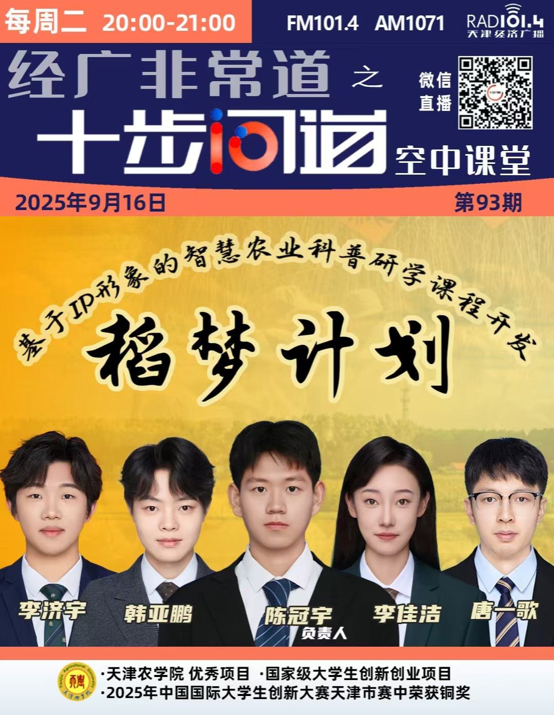 2025年9月16日,天津经济广播、天津经济广播《十步问道空中课堂》、十步问道公众号报道taptap点点园艺园林学院温文、张俊老师指导“稻梦计划”基于IP形象的智慧农业科普研学课程开发。