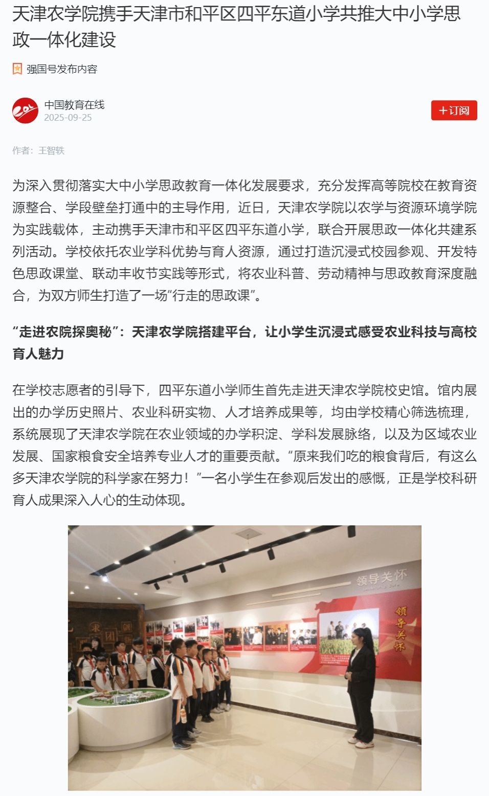 2025年9月25日,学习强国平台、中国教育在线网报道,taptap点点以农学与资源环境学院为实践载体,主动携手天津市和平区四平东道小学,联合开展思政一体化共建系列活动。