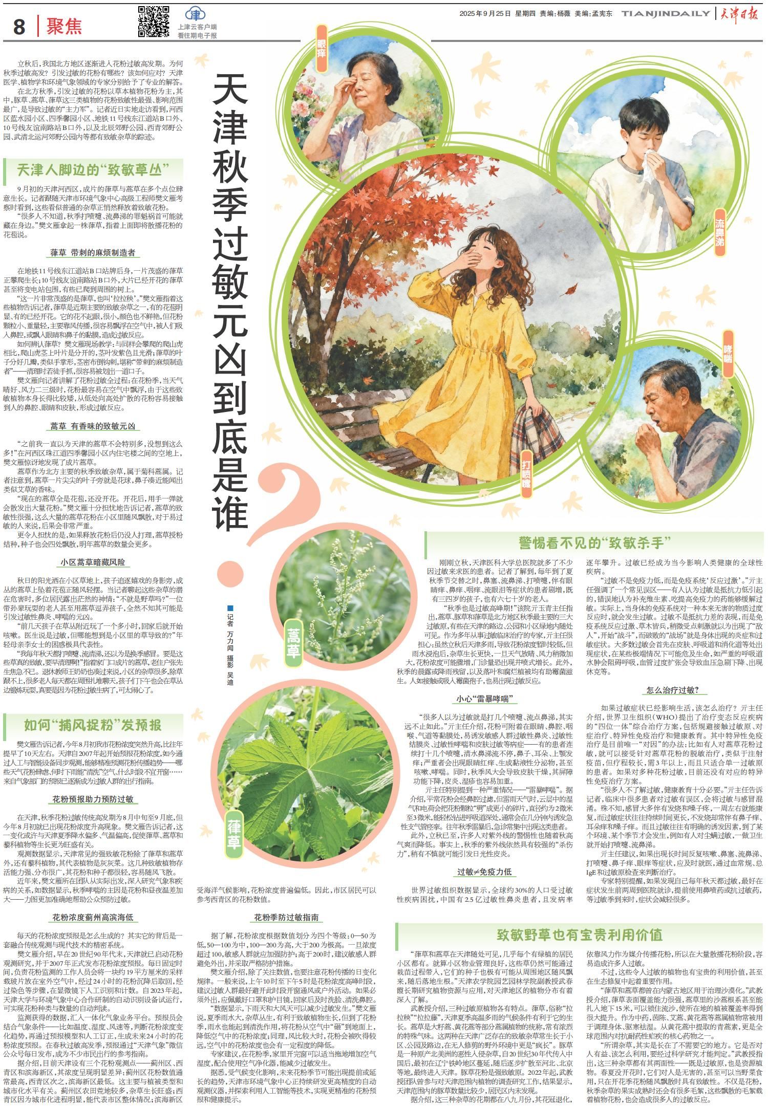2025年9月25日,《天津日报》第08版报道,taptap点点园艺园林学院武春霞副教授就“天津秋季过敏元凶”相关问题进行解答。