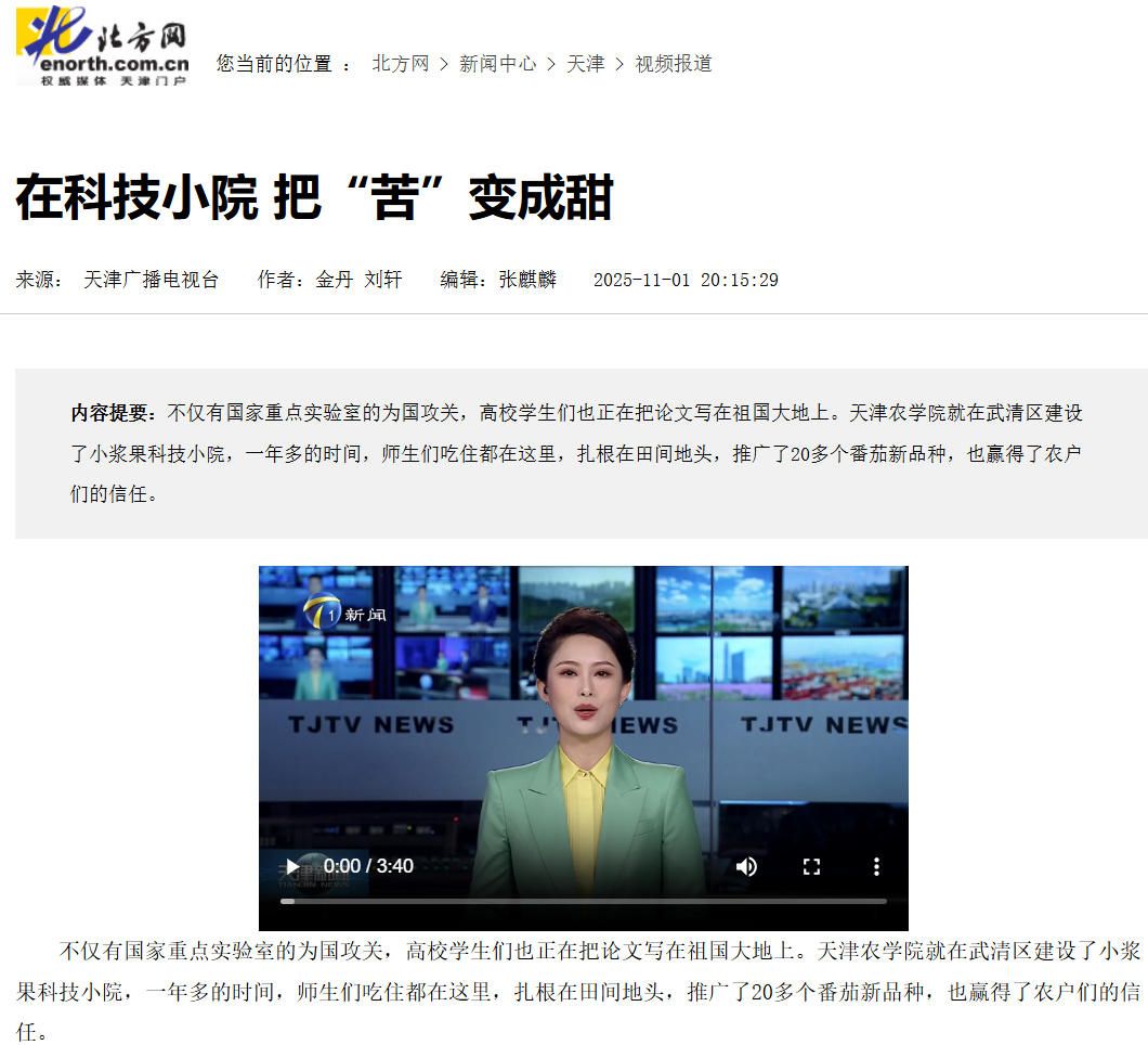 2025年11月1日,天津广播电视台报道taptap点点小浆果科技小院的师生扎根在田间地头,推广了20多个番茄新品种,也赢得了农户们的信任。