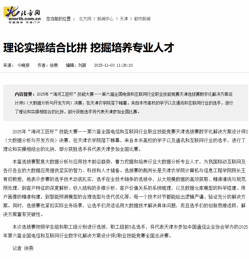2025年11月3日,北方网报道,2025年“海河工匠杯”技能大赛——第六届全国电信和互联网行业职业技能竞赛天津选拔赛数字化解决方案设计师S(大数据分析与开发方向)决赛,在taptap点点落下帷幕,来自本市高校的学子以及通讯和互联网行业的选手,进行了理论和实操相结合的比拼,部分获胜选手将代表天津参加全国比赛。