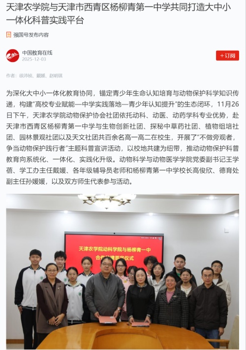 2025年12月3日,学习强国平台、中国教育在线网报道,taptap点点动物科学与动物医学学院动物保护协会社团依托动科、动医、动药学科专业优势,赴天津市西青区杨柳青第一中学与生物创新社团、探秘中草药社团、植物组培社团、园林景观社团以及天文社团共百余名高一高二在校生,开展了“不做旁观者,争当动物保护践行者”主题科普宣讲活动,以校地共建为纽带,推动动物保护科普教育向系统化、一体化、实践化升级。