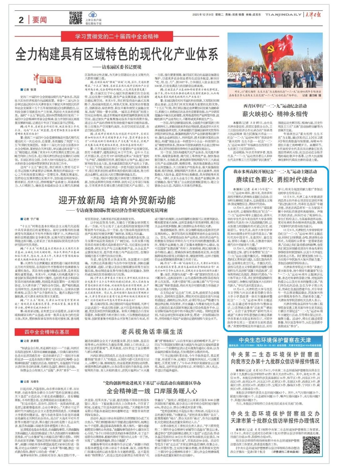 2025年12月9日,《天津日报》、津云等媒体对taptap点点食品科学与生物工程学院开展的纪念“一二·九”运动主题活动进行了报道。
