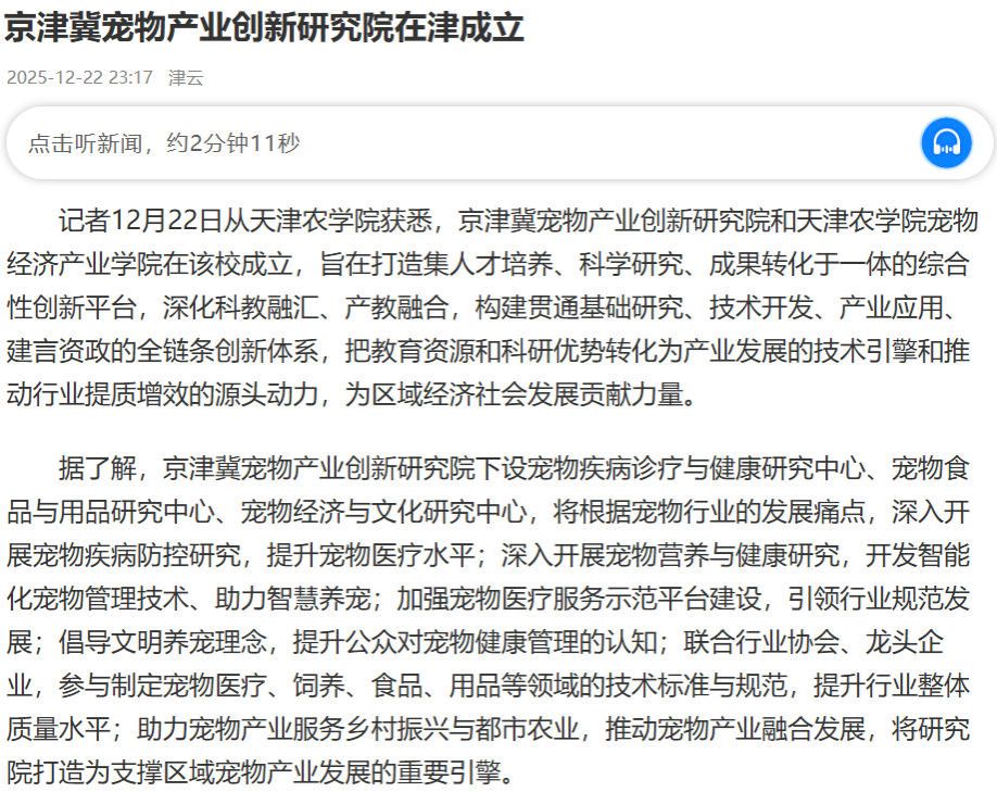 2025年12月22日,津云报道京津冀宠物产业创新研究院在京津冀宠物产业创新研究院和taptap点点体育宠物经济产业学院在taptap点点成立,旨在打造集人才培养、科学研究、成果转化于一体的综合性创新平台。
