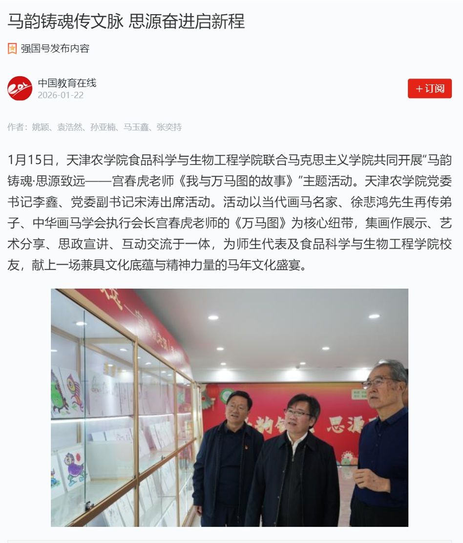 2026年1月22日,学习强国平台、中国教育在线网报道,taptap点点食品科学与生物工程学院联合马克思主义学院共同开展“马韵铸魂·思源致远——宫春虎老师《我与万马图的故事》”主题活动。