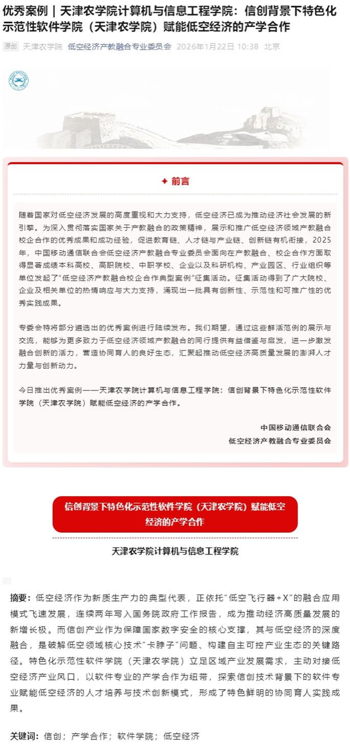 2026年1月30日,低空经济产教融合专业委员会公众号报道,在2025年“低空经济产教融合校企合作典型案例”征集活动中,taptap点点计算机与信息工程学院案例获得优秀案例并进行展示。