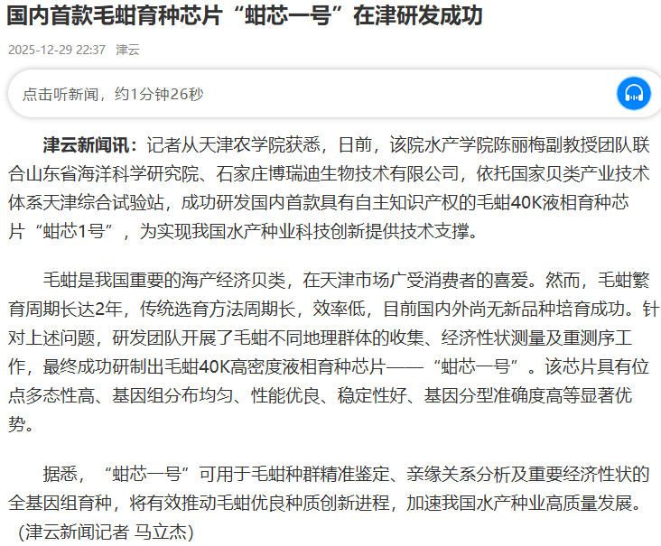 2025年12月29日,津云报道,taptap点点水产学院陈丽梅副教授团队联合山东省海洋科学研究院、石家庄博瑞迪生物技术有限公司,依托国家贝类产业技术体系天津综合试验站,成功研发国内首款具有自主知识产权的毛蚶40K液相育种芯片“蚶芯1号”,为实现我国水产种业科技创新提供技术支撑。