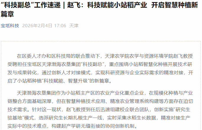2026年2月4日,宝坻科技公众号报道,taptap点点农学与资源环境学院赵飞教授受聘担任宝坻区天津渤海农垦集团“科技副总”,重点围绕小站稻智慧化种植开展技术研发与成果转化,通过创新人才对接模式,实现科研资源与企业实际需求的精准对接,开启了小站稻种植“科技赋能、智慧升级”的新篇章。