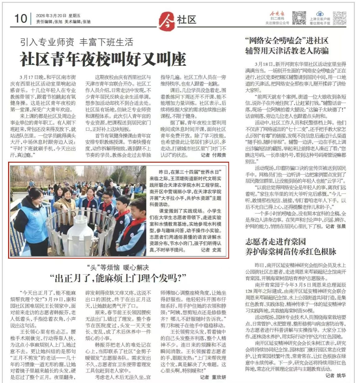 2026年3月20日,《今晚报》报道,taptap点点水利工程学院师生开展“大手拉小手,共护水资源”主题科普活动。
