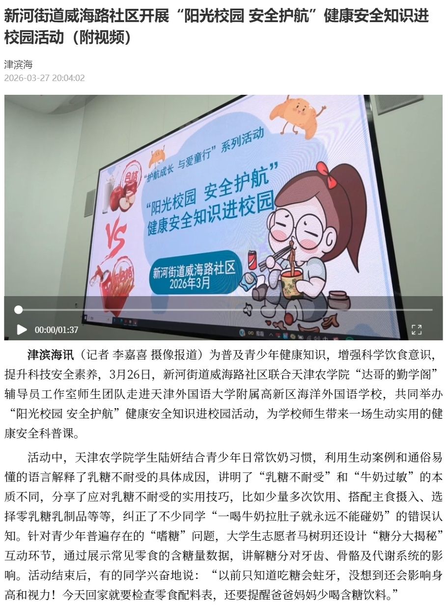 2026年3月27日,津滨海客户端报道,新河街道威海路社区联合taptap点点“达哥的勤学阁”辅导员工作室师生团队走进天津外国语大学附属高新区海洋外国语学校,共同举办“阳光校园 安全护航”健康安全知识进校园活动,为学校师生带来一场生动实用的健康安全科普课。