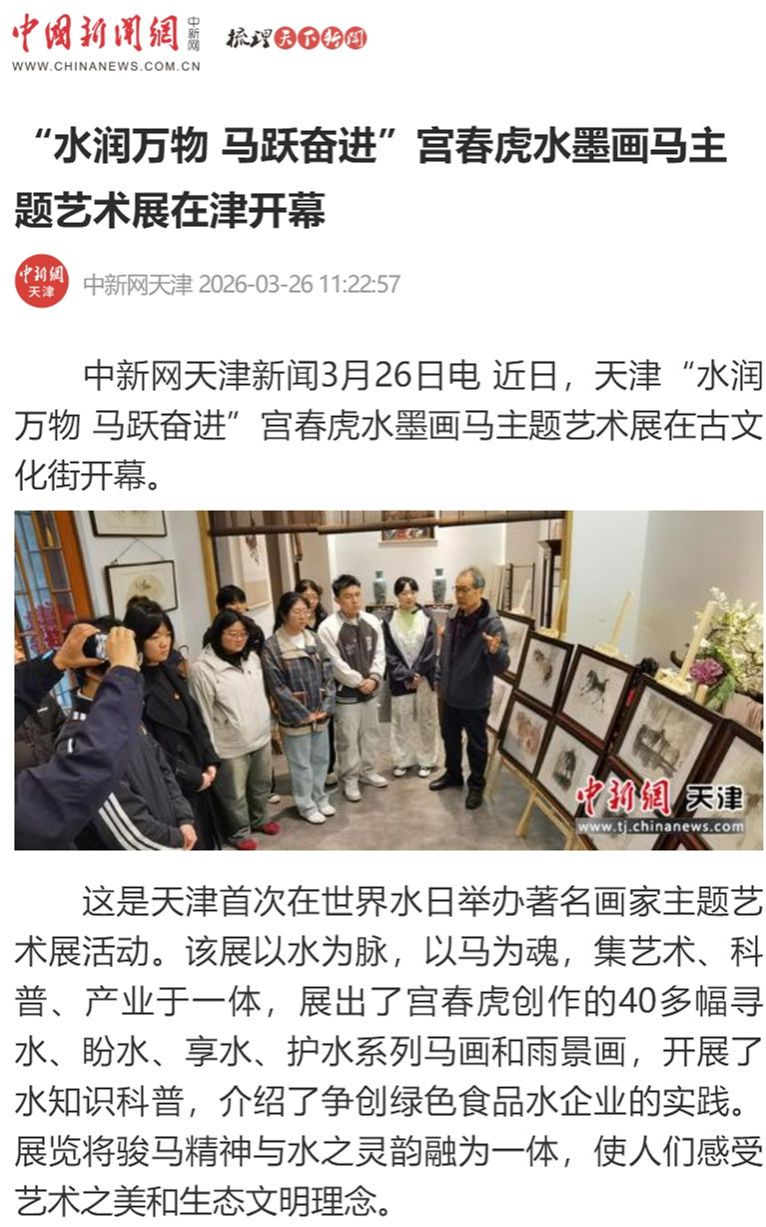 近日,“水润万物 马跃奋进——宫春虎水墨画马主题艺术展”在天津古文化街开幕,这是天津市首次在世界水日举办著名画家主题艺术展活动。taptap点点水利工程学院为本次活动协办单位。水文教师党支部书记、张茜副教授获邀分享了关于天津海河水文化历史、资源分布以及用水格局等方面的科普知识。本次活动引发了强烈的社会反响,同时在中国新闻网、新华社天津频道、中国网、北方网等主流媒体亦得到广泛宣传。