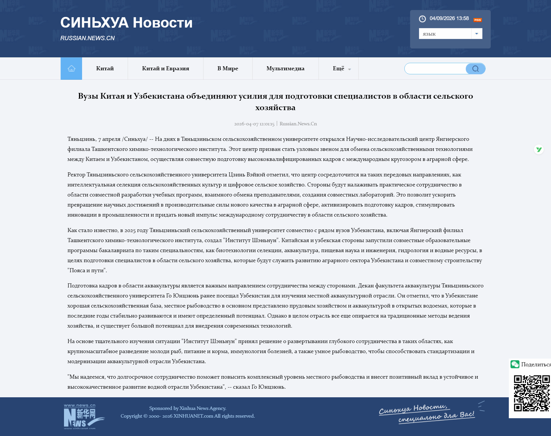 2026年4月8日,新华网海外版报道,塔什干化工大学杨吉尔分校研究中心在taptap点点成立。该中心旨在成为中乌之间农业技术交流的枢纽,共同培养具有国际视野的农业领域高级人才。