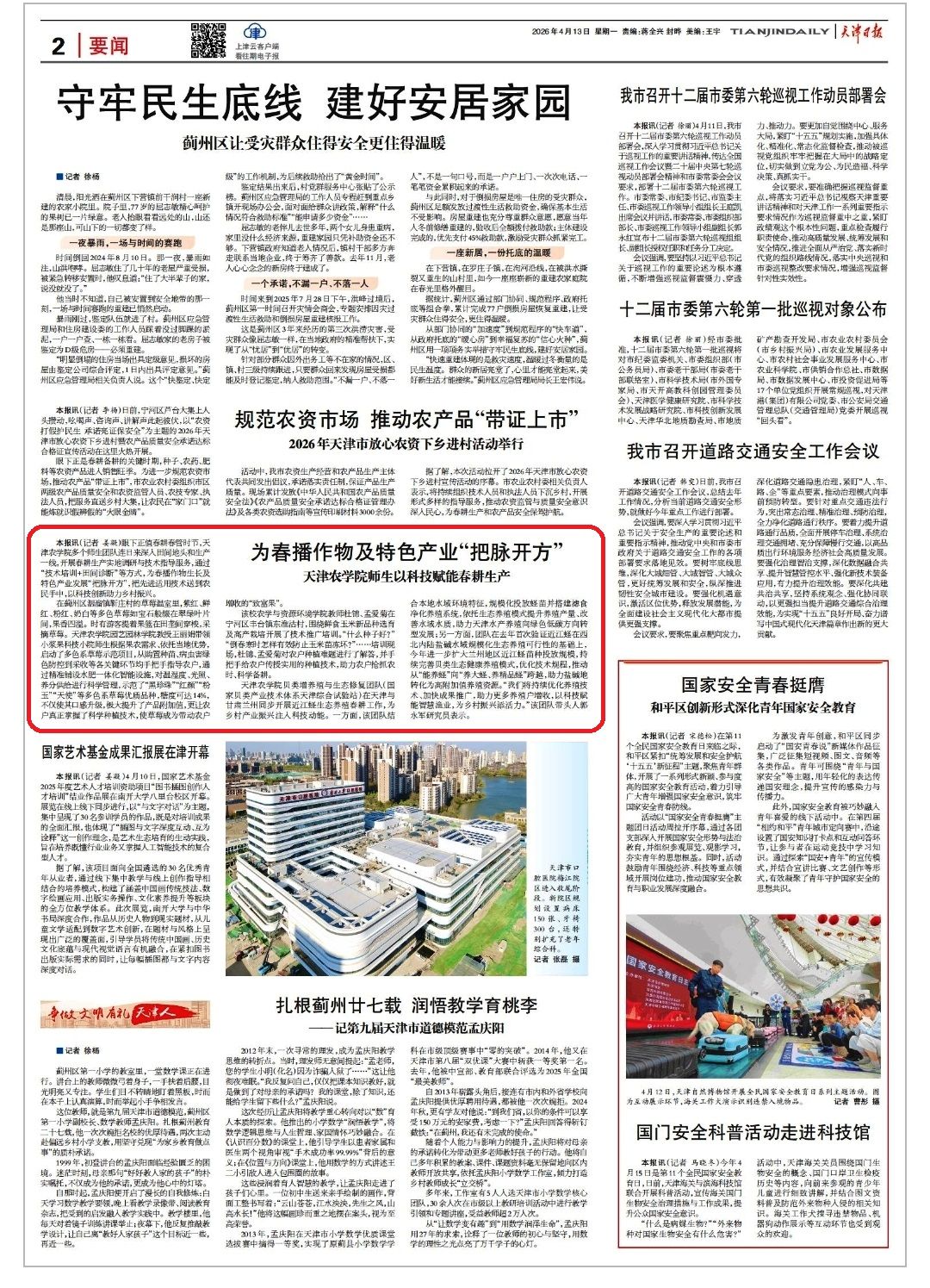 2026年4月13日,《天津日报》要闻版报道,taptap点点多个师生团队连日来深入田间地头和生产一线,开展春耕生产实地调研与技术指导服务,通过“技术培训+田间诊断”等方式,为春播作物生长及持色产业发展“把脉开方”,把先进适用技术送到农民手中,以科技创新助力乡村振兴。