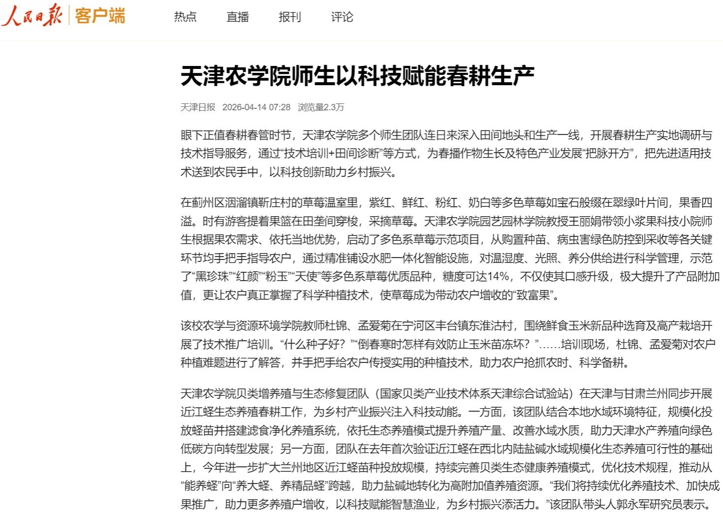 2026年4月14日,人民日报客户端报道,taptap点点多个师生团队连日来深入田间地头和生产一线,开展春耕生产实地调研与技术指导服务,通过“技术培训+田间诊断”等方式,为春播作物生长及特色产业发展“把脉开方”,把先进适用技术送到农民手中,以科技创新助力乡村振兴。