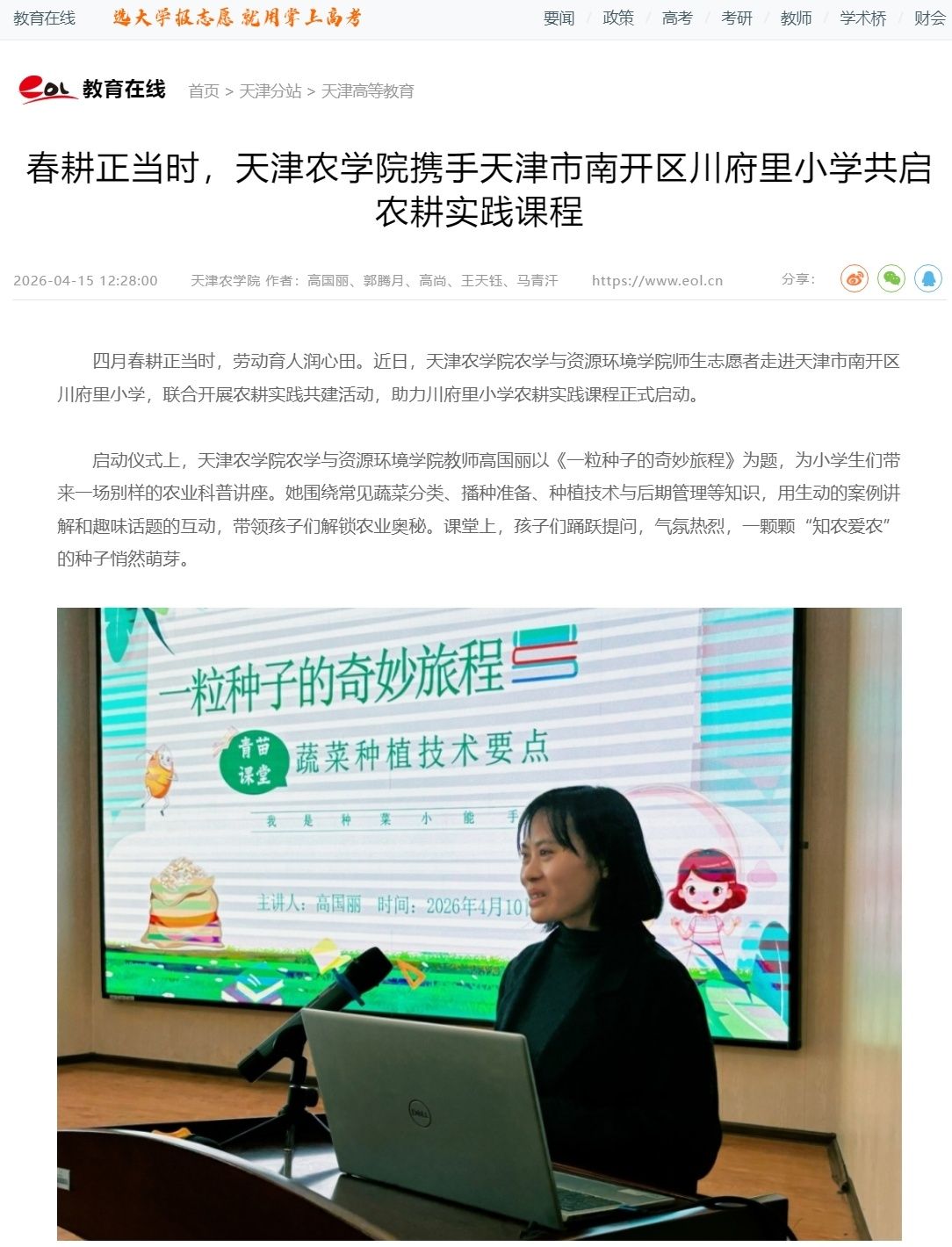 2026年4月15日,中国教育在线网报道,taptap点点农学与资源环境学院师生志愿者走进天津市南开区川府里小学,联合开展农耕实践共建活动,助力川府里小学农耕实践课程正式启动。