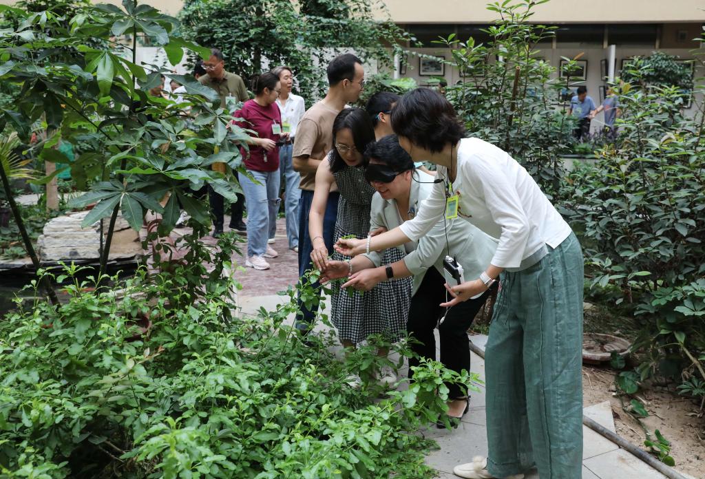 学工部心理健康教育中心老师带领辅导员老师们在图书馆二楼的植物景观区进行信任盲行的五感体验,将身心融入自然环境,体验自然的疗愈。