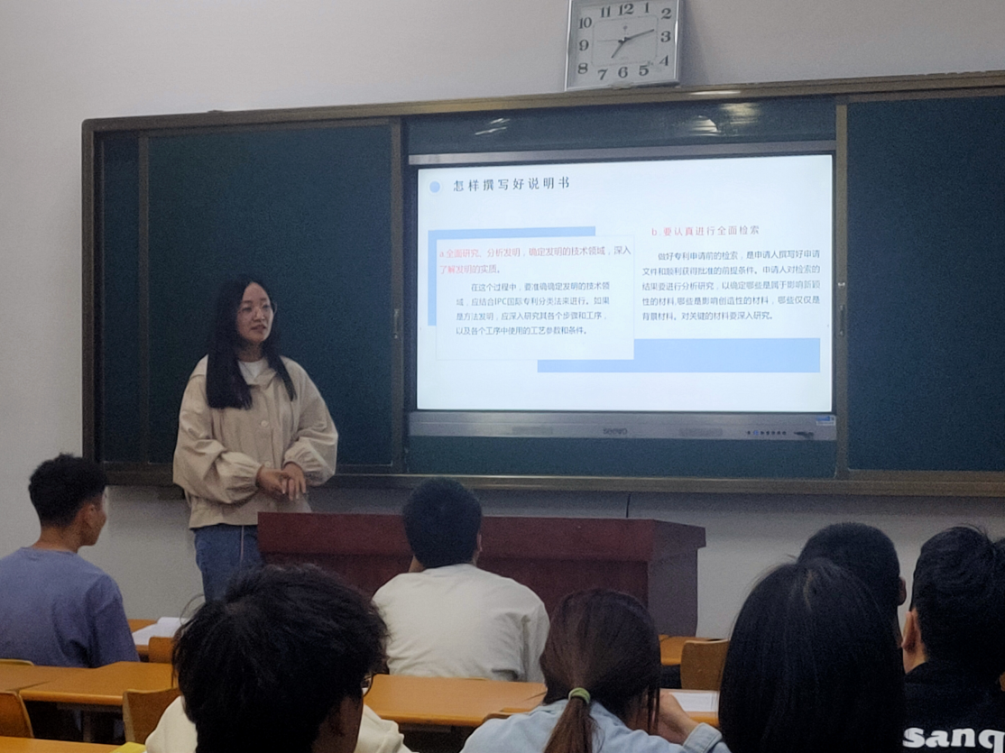 为进一步推动科技创新,促进知识产权保护,beat365在线唯一官网学生会副主席孙瑞环在4月29日晚自习于22教学楼507教室为20级软件技术的各位同学进行专利说明撰写讲解活动。