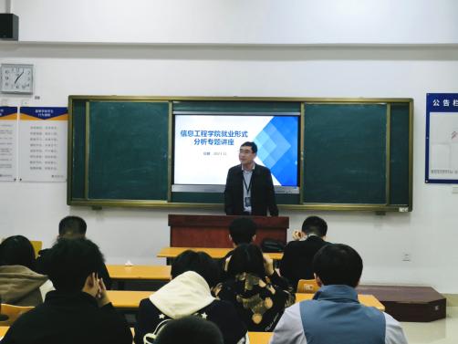 为了帮助学生更好地了解当前就业形势,明确自身职业规划,以及提升就业竞争力,beat365在线唯一官网于2023年11月8日在22号楼509开展就业形势分析专题讲座。本次讲座邀请华道信息科技(德州)有限公司廉东旭主讲,他以自己丰富的从业经验和深入的就业形势分析数据为同学们带来了一场生动的讲座。