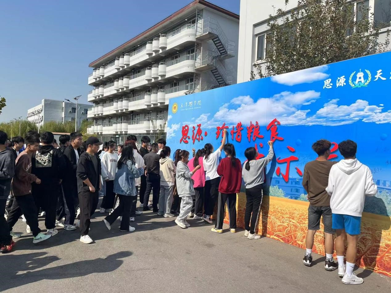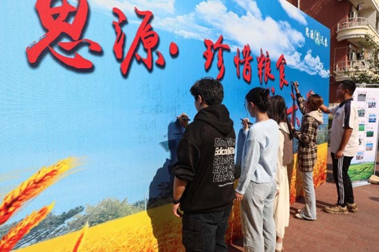 随后,校工会、校团委向全校师生发起“思源·珍惜粮食我示范”主题倡议书,号召师生传承勤俭节约优良传统、弘扬爱粮惜粮节粮美德、营造爱粮惜粮节粮浓厚氛围,在服务国家粮食安全,助力实施乡村振兴战略中勇担强农兴农使命,为加快推进农业农村现代化、建设农业强国贡献力量。活动现场的师生共同在“思源·珍惜粮食我示范”主题签名墙上签名。活动现场还设置了由师生制作的种艺画展区,校领导与师生代表一同参观了种艺画作品。