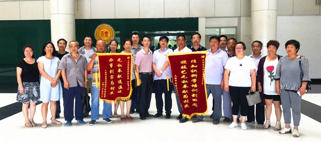 7月10日上午,骄阳似火,在驻村技术帮扶组王金良组长和村支部书记带领下,天津武清区陈咀镇大旺村一行十一人向园艺园林学院送来两面锦旗。