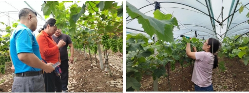 2025年1月中旬,田淑芬研究员带领团队师生深入云南建水青龙镇促早栽培的阳光玫瑰大棚,仔细调研葡萄低温跑花的原因,针对当地的土壤和气候特点,给予适宜的解决办法;2月中旬,在海南乐东县避雨栽培的葡萄园中,田淑芬研究员和团队教师一起检测葡萄的叶绿素荧光参数,为选择合理的补光光谱和补光时间提供技术支撑。3月初,田淑芬研究员到浙江宁波余姚市临山镇作了《我国葡萄产业新质发展面临的挑战及出路》的专题培训,100多位种植户和科技工作者参加培训。
