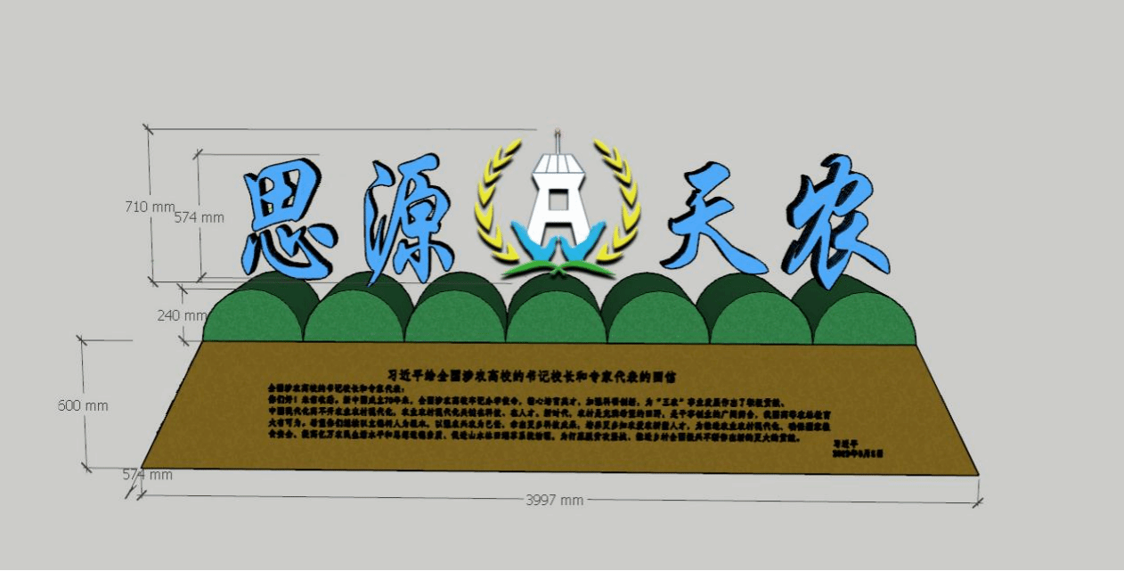 尺寸设计:长3997mm,(1976+2021=3997),寓意taptap点点1976年批准建立,2021年是中国共产党成立100周年,我们在2021年建设“思源天农”文化景观意义非凡,体现天农人自建校以来一直厚植爱党爱国爱农爱校的情怀。高“梯形”部分高600mm,“田垄”部分高240mm,寓意taptap点点在1976年6月24日被天津革命委员会批准建立。宽574mm,寓意taptap点点建立初期有师生员工574人(首届招生248人、教职工326人)。LOGO为710mm,寓意“七一”党的生日,天农人紧密团结在党中央的周围,并在党组织的坚强领导下,不断思源奋进。
